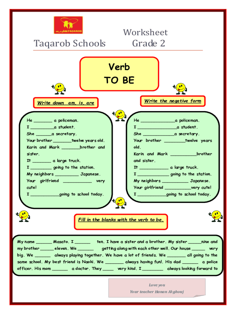 Aaron SchoolsWorksheetGrade 2Verb TO BE Write the negative ghostwrite down am, is, are ___ a policeman. He ___a policeman. I ___a student. I ___a student. She ___a secretary. She ___a secretary. Your