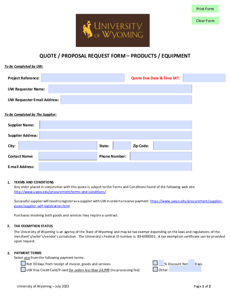 Print Form Clear Formulae / PROPOSAL REQUEST FORM PRODUCTS / EQUIPMENT To Be Completed by UW:Project Reference:Quote Due Date & Time MT:UW Requester Name: UW Requester Email Address: To Be Completed