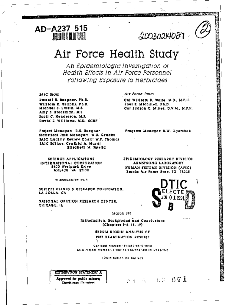 ADA237 515!Iiillill[!lll II111 11. 11!111111tlll liilliAir Force Health Study An Epidemiologic in vestigation of Health Effects In Air Force PersonnelFollowing Exposure to Herbicides SAIC TeamAir
