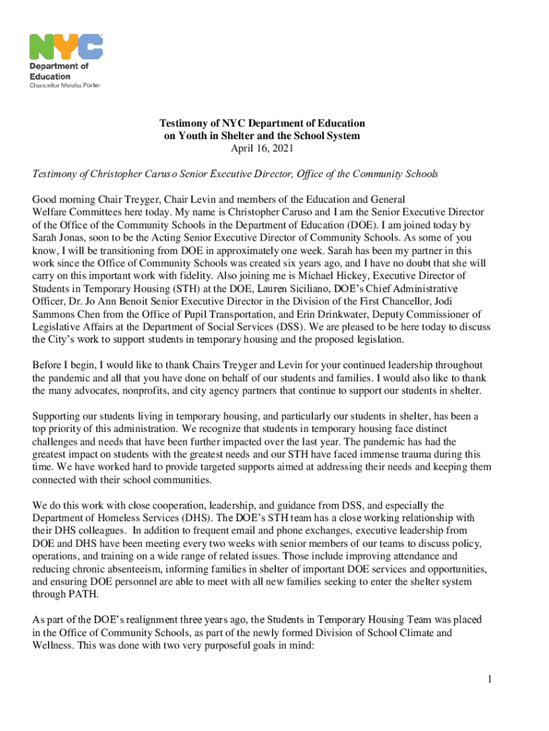 Testimony of NYC Department of Education on Youth in Shelter and the School System April 16, 2021 Testimony of Christopher Caruso Senior Executive Director, Office of the Community Schools Good morning