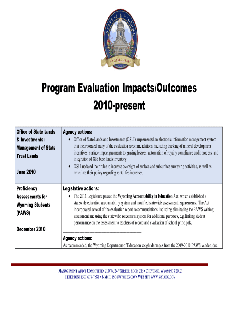 Program Evaluation Impacts/Outcomes 2010present Office of State Lands & Investments: Management of State Trust Lands June 2010 Proficiency Assessments for Wyoming Students (PAWS) December 2010Agency