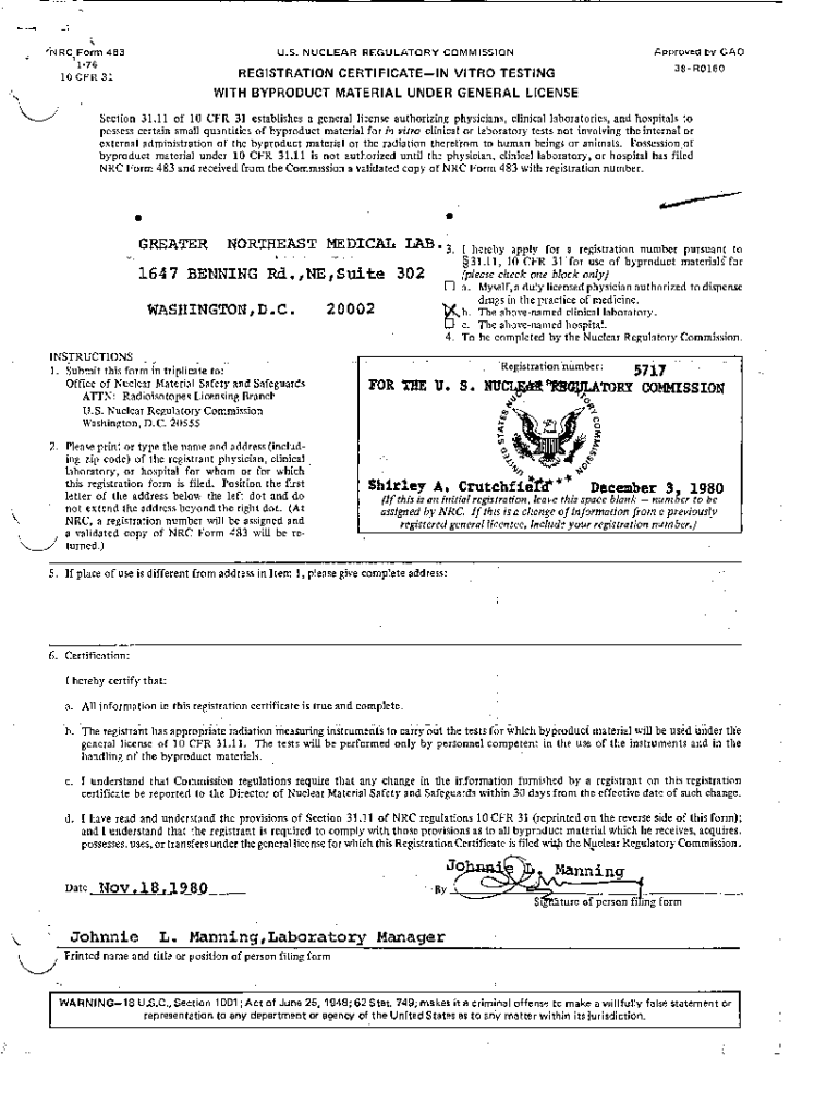 \'(RC Form 483 176 10CFR31Approved by GAO 3O6 38R0160U. S. NUCLEAR REGULATORY COMMISSIONREGISTRATION CERTIFICATE IN VITO TESTING WITH BYPRODUCT MATERIAL UNDER GENERAL LICENSESection 31.11 of 10 CFR
