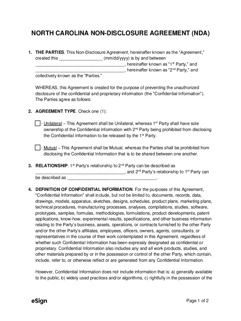 NORTH CAROLINA NONDISCLOSURE AGREEMENT (NDA) 1. THE PARTIES. This Nondisclosure Agreement, hereinafter known as the Agreement, created this ___ (mm/dd/YYY) is by and between ___, hereinafter known