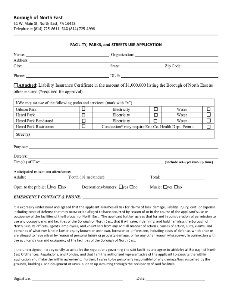 Borough of North East31 W. Main St, North East, PA 16428 Telephone: (814) 7258611, FAX (814) 7254996FACILITY, PARKS, and STREETS USE APPLICATION Name: Address: City:Organization: State:Phone:DL #:Zip