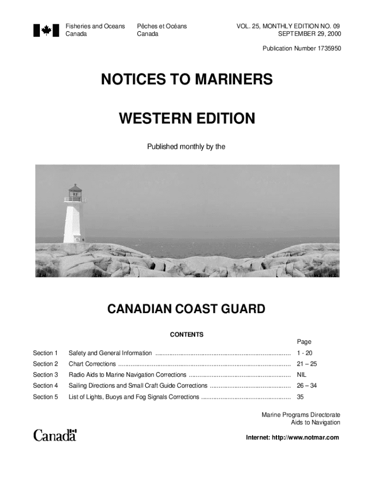 Fisheries and Oceans CanadaPches et Ocans CanadaVOL. 25, MONTHLY EDITION NO. 09 SEPTEMBER 29, 2000 Publication Number 1735950NOTICES TO MARINERS WESTERN EDITION Published monthly by theCANADIAN COAST