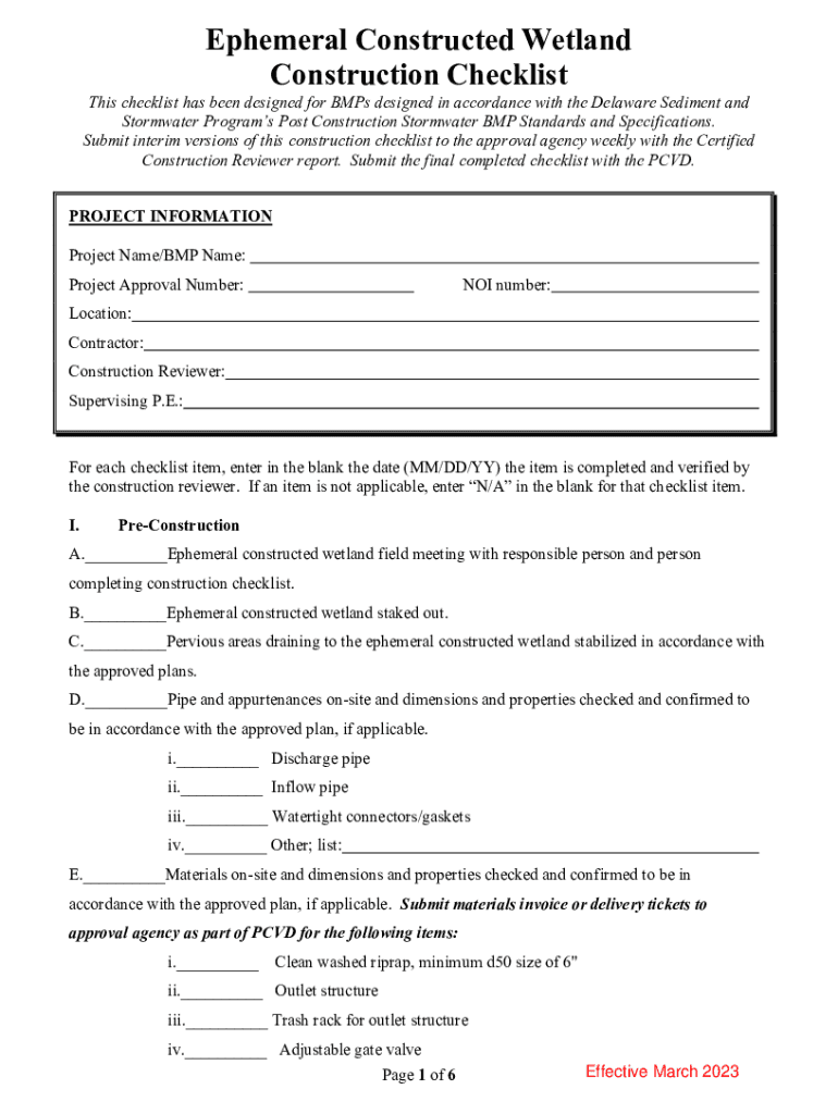 Ephemeral Constructed Wetland Construction ChecklistThis checklist has been designed for BMPs designed in accordance with the Delaware Sediment and Stormwater Programs Post Construction Stormwater