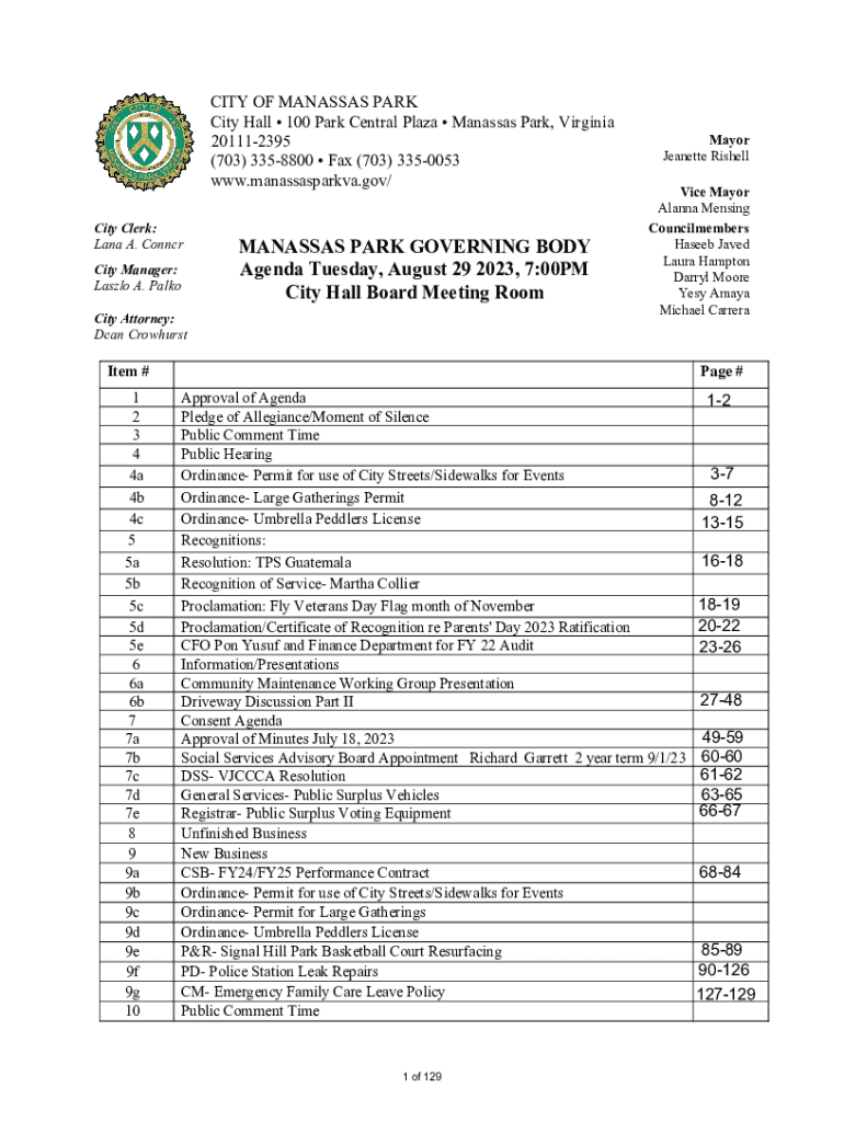 CITY OF MANASSAS PARK City Hall 100 Park Central Plaza Manassas Park, Virginia 201112395 (703) 3358800 Fax (703) 3350053 www.manassasparkva.gov/ City Clerk: Lana A. Conner City Manager: Laszlo A.