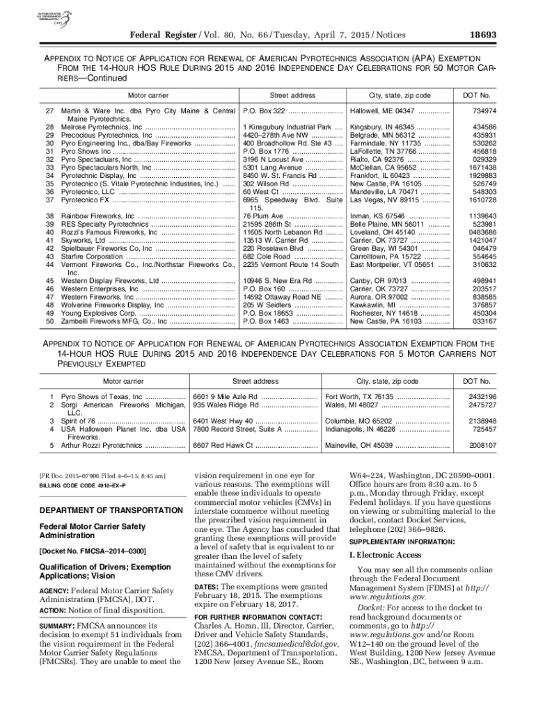 Federal Register / Vol. 80, No. 66 / Tuesday, April 7, 2015 / Notices18693APPENDIX TO NOTICE OF APPLICATION FOR RENEWAL OF AMERICAN PYROTECHNICS ASSOCIATION (APA) EXEMPTION FROM THE 14HOUR HOS RULE