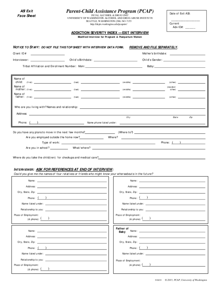 Face SheetParentChild Assistance Program (CAP)Date of Exit AS:FETAL ALCOHOL & DRUG UNIT