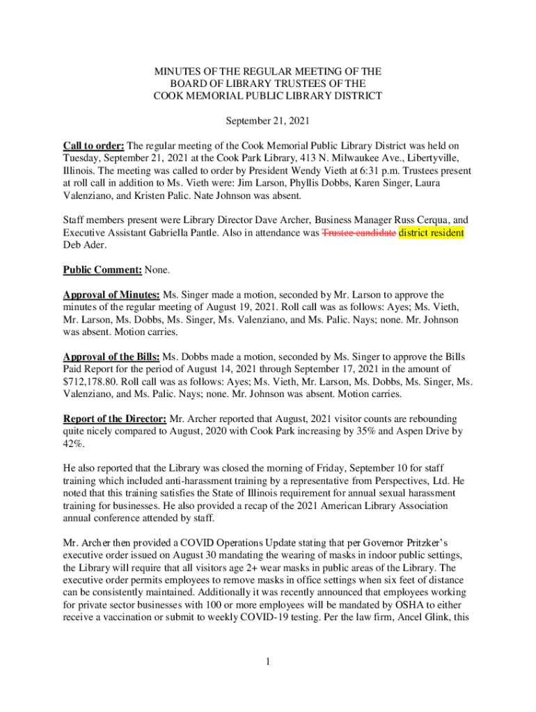 MINUTES OF THE REGULAR MEETING OF THE BOARD OF LIBRARY TRUSTEES OF THE COOK MEMORIAL PUBLIC LIBRARY DISTRICT September 21, 2021 Call to order: The regular meeting of the Cook Memorial Public Library