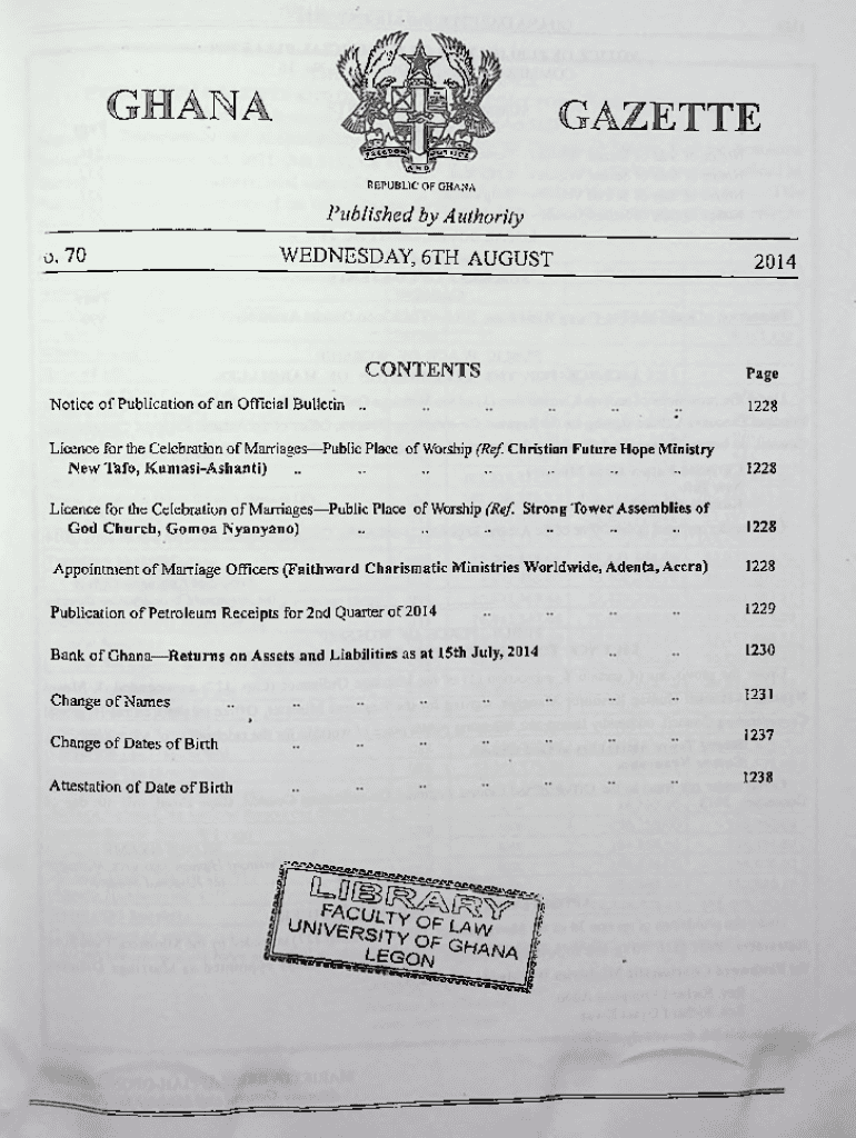 LrJGHANAhGAZETTE gttjjogput ittT+. M Q,REPUBLIC OF GHANAPublished by Authority o. 70WEDNESDAY, 6TH AUGUSTCONTENTS2014PageNotice of Publication of an Official Bulletin ..1228Licence for the Celebration
