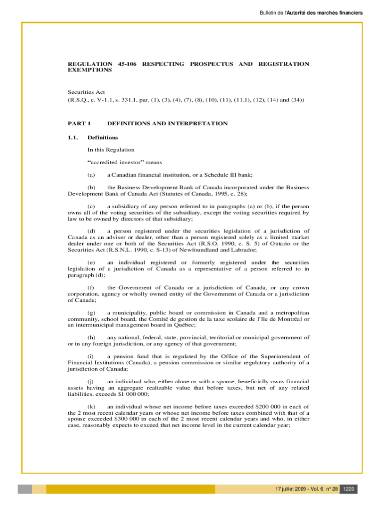 Bulletin de l\'Autofit DES marches financiersREGULATION EXEMPTIONS45106RESPECTINGPROSPECTUSANDREGISTRATIONSecurities Act (R.S.Q., c. V1.1, s. 331.1, par. (1), (3), (4), (7), (8), (10), (11), (11.1),