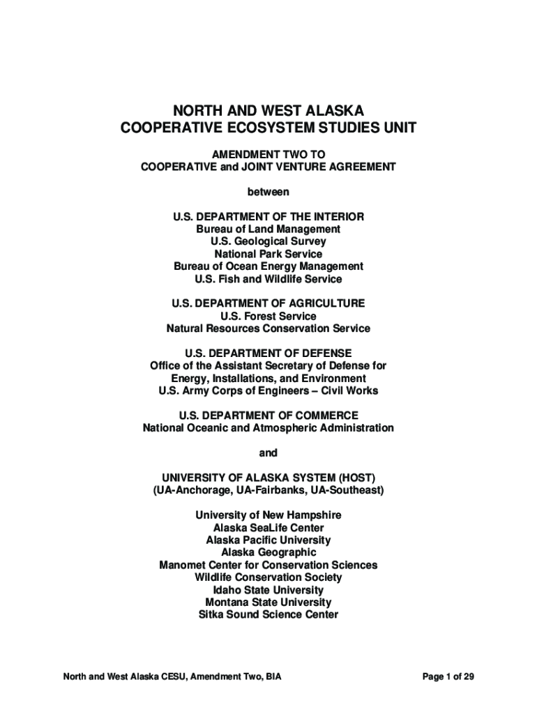 NORTH AND WEST ALASKA COOPERATIVE ECOSYSTEM STUDIES UNIT AMENDMENT TWO TO COOPERATIVE and JOINT VENTURE AGREEMENT between U.S. DEPARTMENT OF THE INTERIOR Bureau of Land Management U.S. Geological