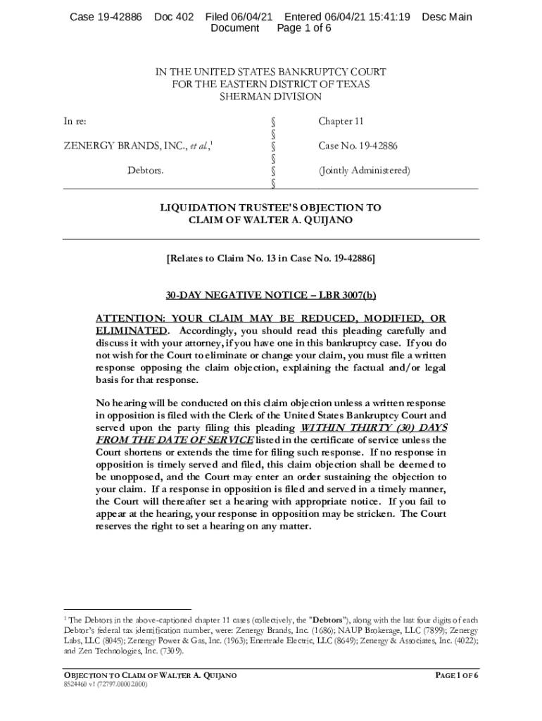 Case 1942886Doc 402Filed 06/04/21 Entered 06/04/21 15:41:19 Document Page 1 of 6Desc MainIN THE UNITED STATES BANKRUPTCY COURT FOR THE EASTERN DISTRICT OF TEXAS SHERMAN DIVISION In re: ZENERGY BRANDS,