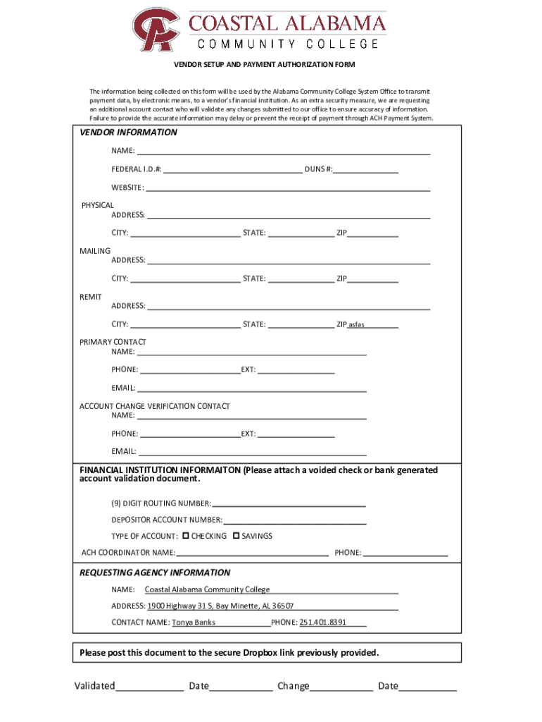 VENDOR SETUP AND PAYMENT AUTHORIZATION From The information being collected on this form will be used by the Alabama Community College System Office to transmit payment data, by electronic means,