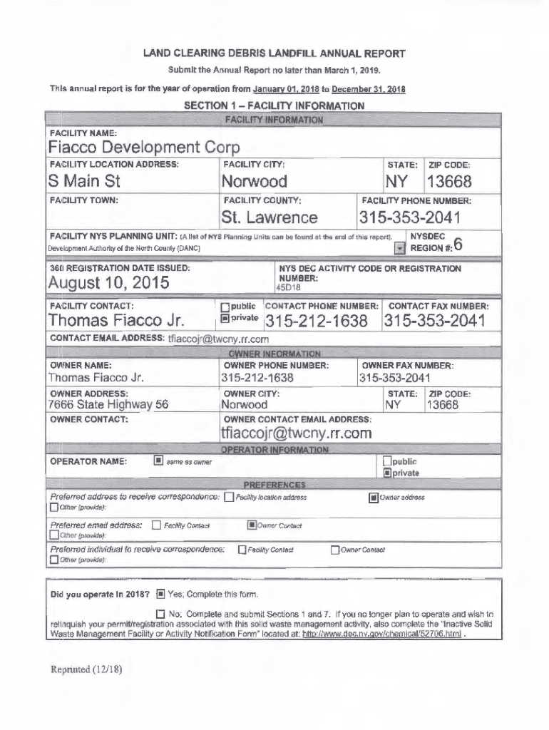 LAND CLEARING DEBRIS LANDFILL ANNUAL REPORT Submit the dual Report no later than March 1, 2019. This annual report is for the year of operation from January 01, 2018, to December 31, 2018SECTION 1