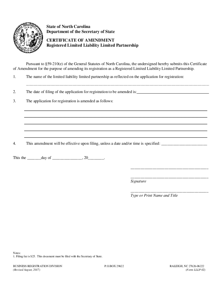 State of North Carolina Department of the Secretary of State CERTIFICATE OF AMENDMENT Registered Limited Liability Limited PartnershipPursuant to 59210(e) of the General Statutes of North Carolina,