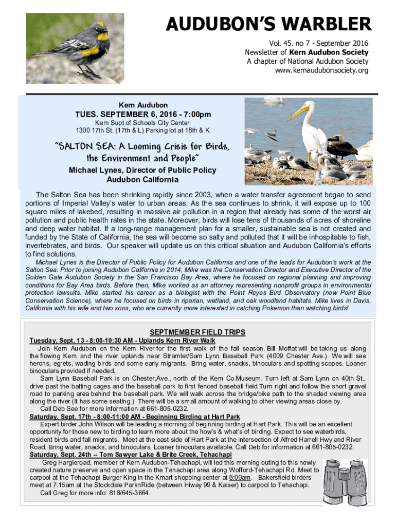 AUDUBON WARBLER Vol. 45. No 7 September 2016 Newsletter of Kern Audubon Society A chapter of National Audubon Society www.kernaudubonsociety.orgKern AudubonTUES. SEPTEMBER 6, 2016 7:00pm Kern Supt