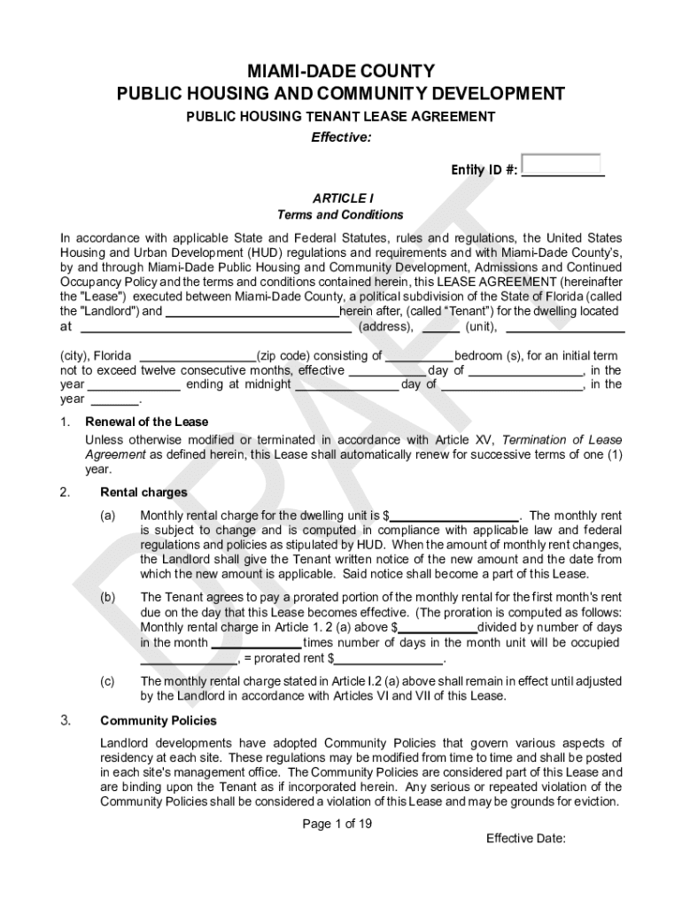 MIA MIDADE COUNTY PUBLIC HOUSING AND COMMUNITY DEVELOPMENT PUBLIC HOUSING TENANT LEASE AGREEMENT Effective:Entity ID #: ARTICLE I Terms and Conditions In accordance with applicable State and Federal