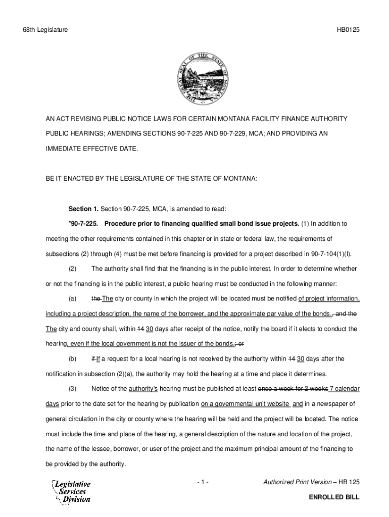 68th LegislatureHB0125AN ACT REVISING PUBLIC NOTICE LAWS FOR CERTAIN MONTANA FACILITY FINANCE AUTHORITY PUBLIC HEARINGS; AMENDING SECTIONS 907225 AND 907229, MCA; AND PROVIDING AN IMMEDIATE EFFECTIVE