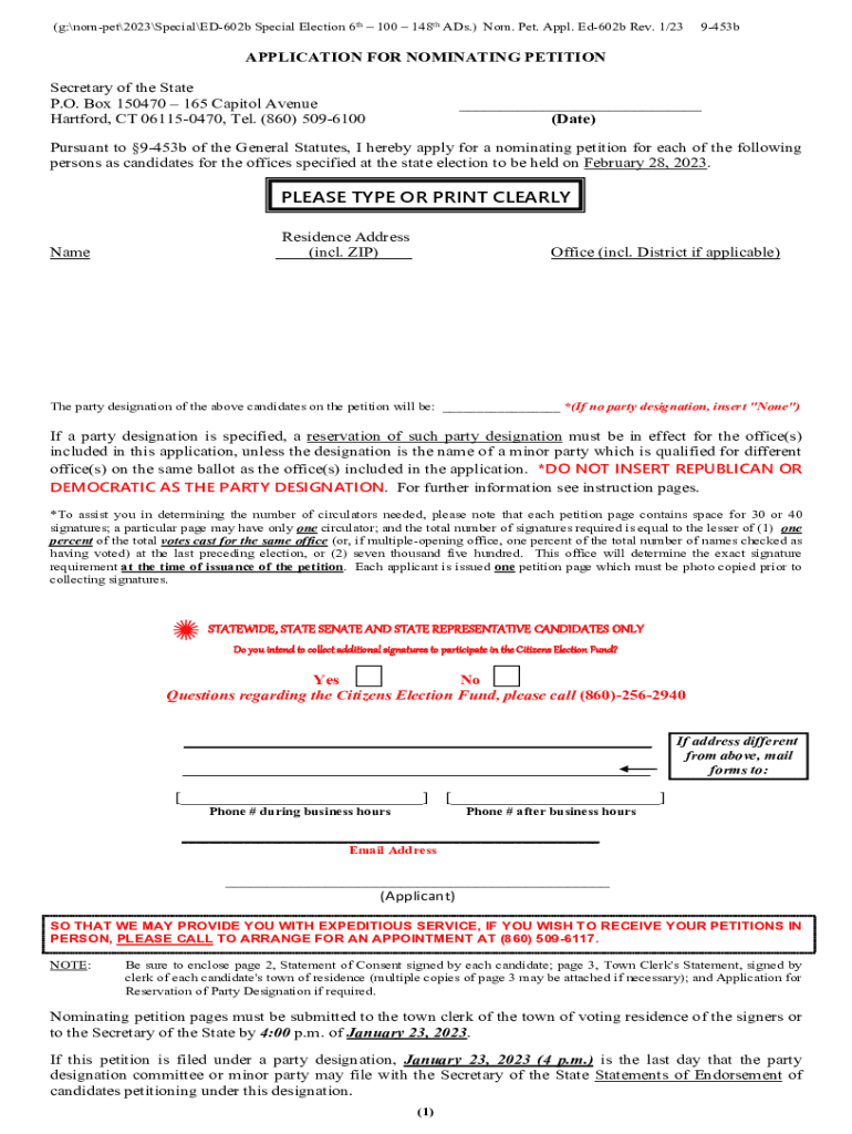 (g:nompet2023SpecialED602b Special Election 6th 100 148th AD's.) Not. Pet. Apply. Ed602b Rev. 1/239453bAPPLICATION FOR NOMINATING PETITION Secretary of the State P.O. Box 150470 165 Capitol Avenue