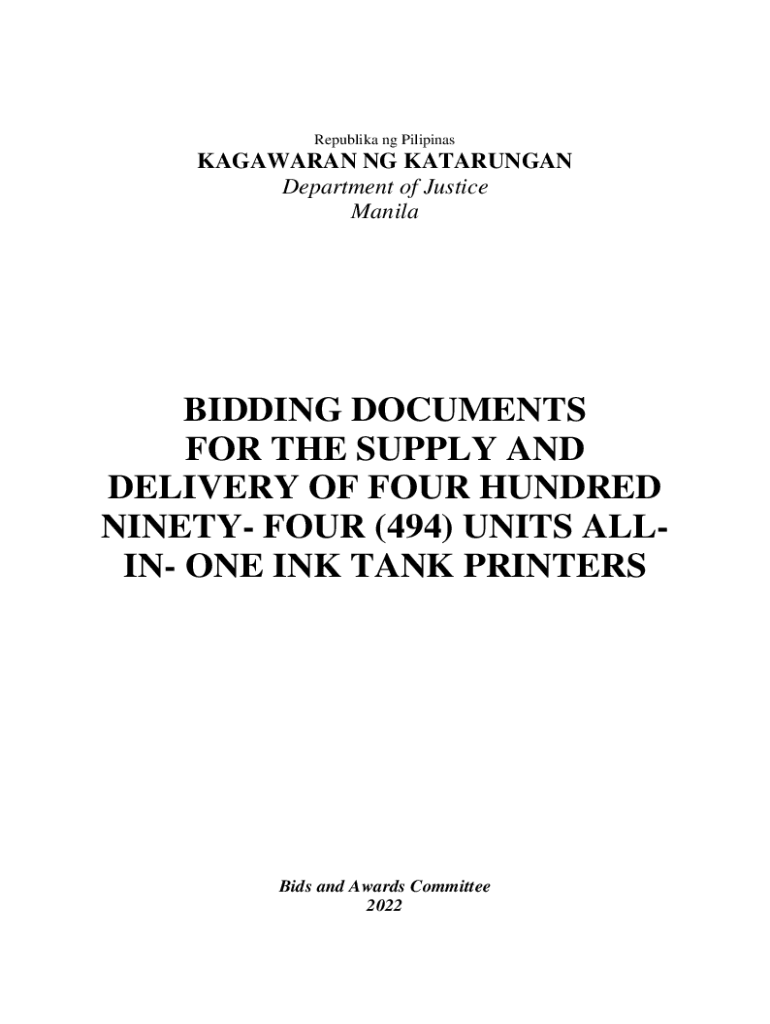 Republican NG PilipinasKAGAWARAN NG KATARINA Department of Justice ManilaBIDDING DOCUMENTS FOR THE SUPPLY AND DELIVERY OF FOUR HUNDRED NINETY FOUR (494) UNITS ALLEN ONE INK TANK PRINTERSBids and Awards
