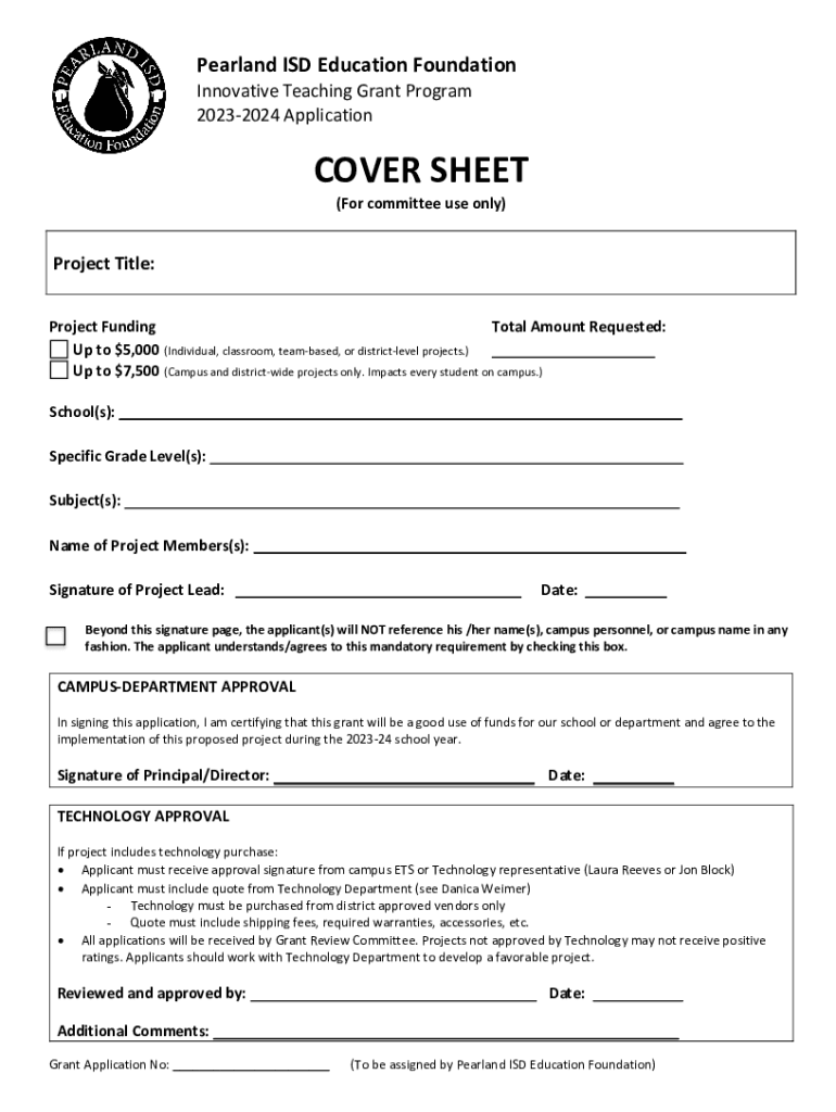Pearland ISD Education Foundation Innovative Teaching Grant Program 20232024 ApplicationCOVER SHEET (For committee use only)Project Title: Total Amount Requested: Project Funding Up to $5,000 (Individual,