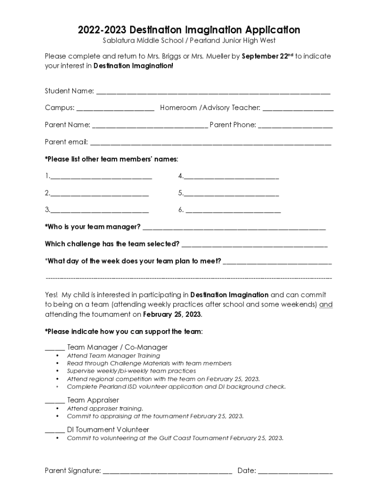 20222023 Destination Imagination Application Sablatura Middle School / Pearland Junior High West Please complete and return to Mrs. Briggs or Mrs. Mueller by September 22nd to indicate your interest