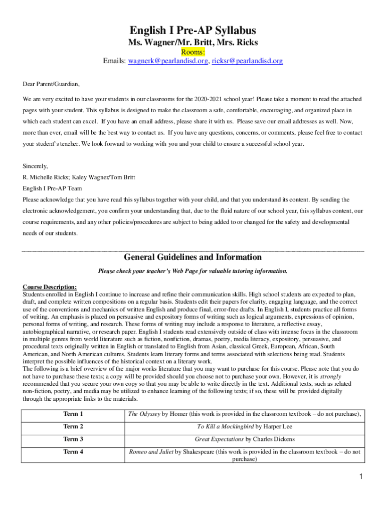English I Prep Syllabus Ms. Wagner/Mr. Britt, Mrs. Ricks Rooms: Emails: wagnerk@pearlandisd.org, ricksr@pearlandisd.org Dear Parent/Guardian, We are very excited to have your students in our classrooms