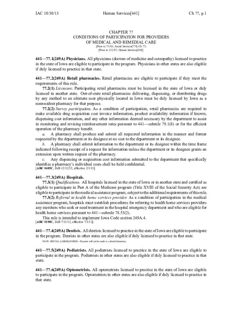 IAC 10/30/13Human Services[441]Ch 77, p.1CHAPTER 77 CONDITIONS OF PARTICIPATION FOR PROVIDERS OF MEDICAL AND REMEDIAL CARE [Prior to 7/1/83, Social Services[770] Ch 77] [Prior to 2/11/87, Human Services[498]]44177.1(249A)