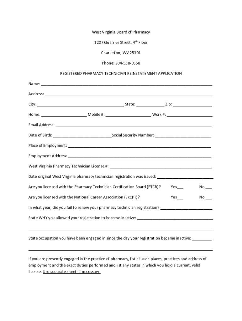 West Virginia Board of Pharmacy 1207 Quarries Street, 4th Floor Charleston, WV 25301 Phone: 3045580558 REGISTERED PHARMACY TECHNICIAN REINSTATEMENT APPLICATION Name: ___ Address: ___ City: ___ State: