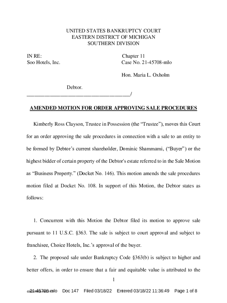 UNITED STATES BANKRUPTCY COURT EASTERN DISTRICT OF MICHIGAN SOUTHERN DIVISION IN RE: Sew Hotels, Inc. Chapter 11 Case No. 2145708mlo Hon. Maria L. OxholmDebtor. ___/ AMENDED MOTION FOR ORDER APPROVING
