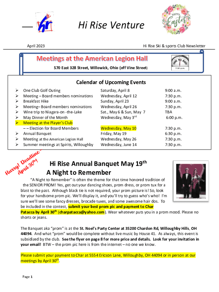 Hi Rise Venture April 2023Hi Rise Ski & sports Club Newsletter570 East 328 Street, Willow, Ohio (off Vine Street)Calendar of Upcoming Events One Club Golf Outing Meeting Board members nominations