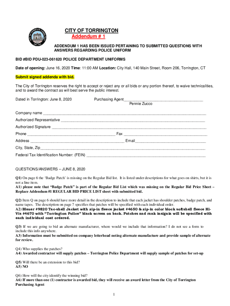 CITY OF TORRINGTON Addendum # 1 ADDENDUM 1 HAS BEEN ISSUED PERTAINING TO SUBMITTED QUESTIONS WITH ANSWERS REGARDING POLICE UNIFORM BID #BID PDU023061620 POLICE DEPARTMENT UNIFORMS Date of opening:
