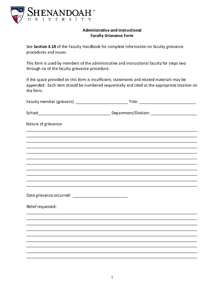 Administrative and Instructional Faculty Grievance Form See Section 4.18 of the Faculty Handbook for complete information on faculty grievance procedures and issues. This form is used by members of