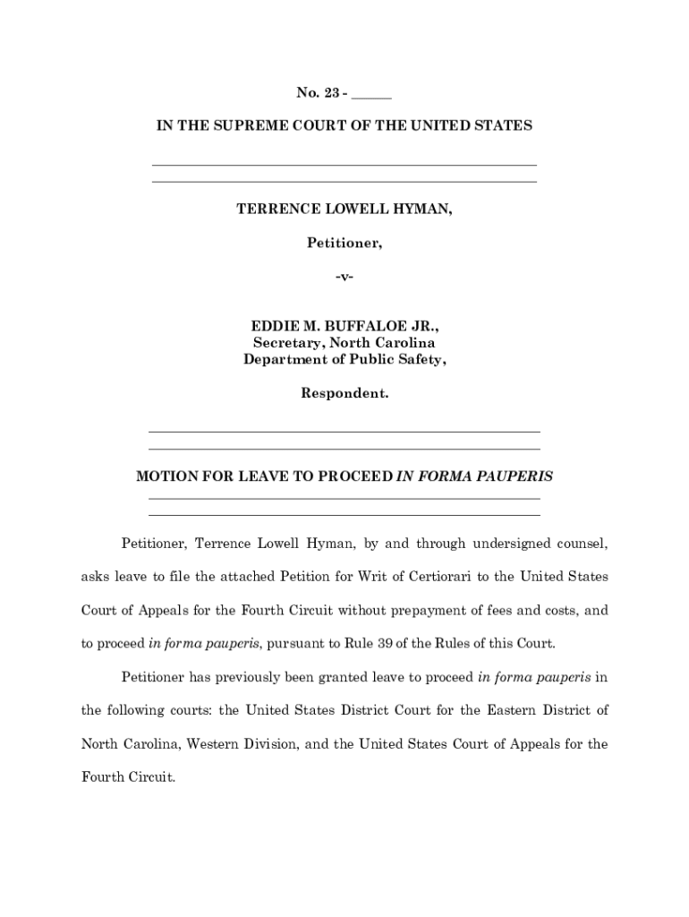 No. 23 ___ IN THE SUPREME COURT OF THE UNITED STATES ___ ___ TERRENCE LOWELL HYMAN, Petitioner, Eddie M. BUFFALO JR., Secretary, North Carolina Department of Public Safety, Respondent. ___ ___ MOTION