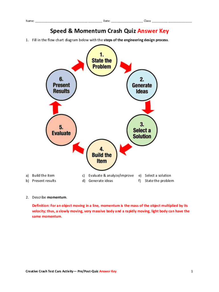 Name: ___ Date: ___ Class: ___Speed & Momentum Crash Quiz Answer Key 1. Fill in the flow chart diagram below with the steps of the engineering design process.a) Build the item b) Present results)