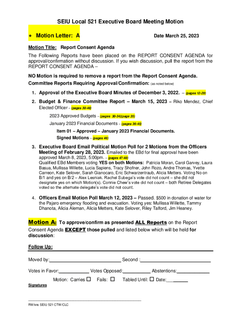 SEU Local 521 Executive Board Meeting Motion* Motion Letter: Date March 25, 2023Motion Title: Report Consent Agenda The Following Reports have been placed on the REPORT CONSENT AGENDA for approval/confirmation