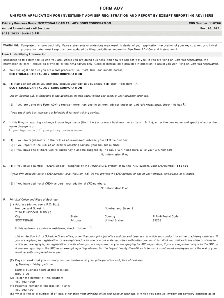 FORM ADV UNIFORM APPLICATION FOR INVESTMENT ADVISER REGISTRATION AND REPORT BY EXEMPT REPORTING ADVISERS Primary Business Name: SCOTTSDALE CAPITAL AdviserS CORPORATION CRD Number: 118786Annual Amendment