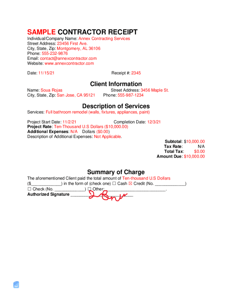 SAMPLE CONTRACTOR RECEIPT Individual/Company Name: Annex Contracting Services Street Address: 23456 First Ave. City, State, Zip: Montgomery, AL 36106 Phone: 5552329876 Email: contact@annexcontractor.com