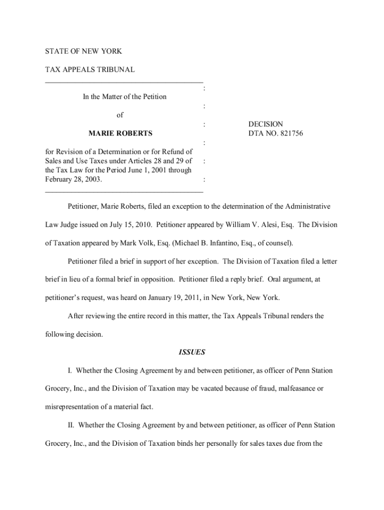 STATE OF NEW YORK TAX APPEALS TRIBUNAL ___ : In the Matter of the Petition : of : MARIE ROBERTSDECISION DTA NO. 821756: for Revision of a Determination or for Refund of Sales and Use Taxes under Articles