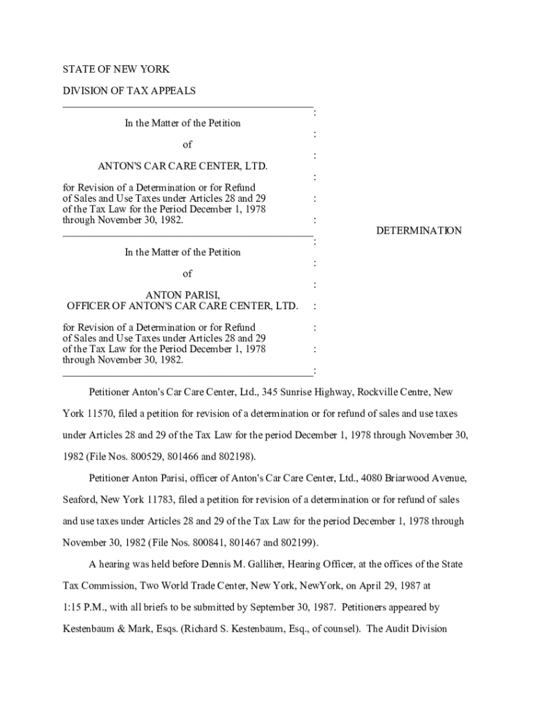 STATE OF NEW YORK DIVISION OF TAX APPEALS ___ In the Matter of the Petition of ANTON\'S CAR CARE CENTER, LTD.: : :: for Revision of a Determination or for Refund of Sales and Use Taxes under Articles