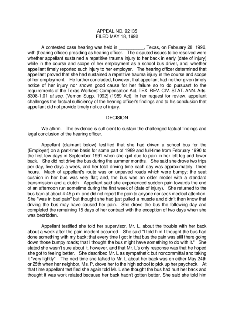 APPEAL NO. 92135 FILED MAY 18, 1992 A contested case hearing was held in ___, Texas, on February 28, 1992, with (hearing officer) presiding as hearing officer. The disputed issues to be resolved were
