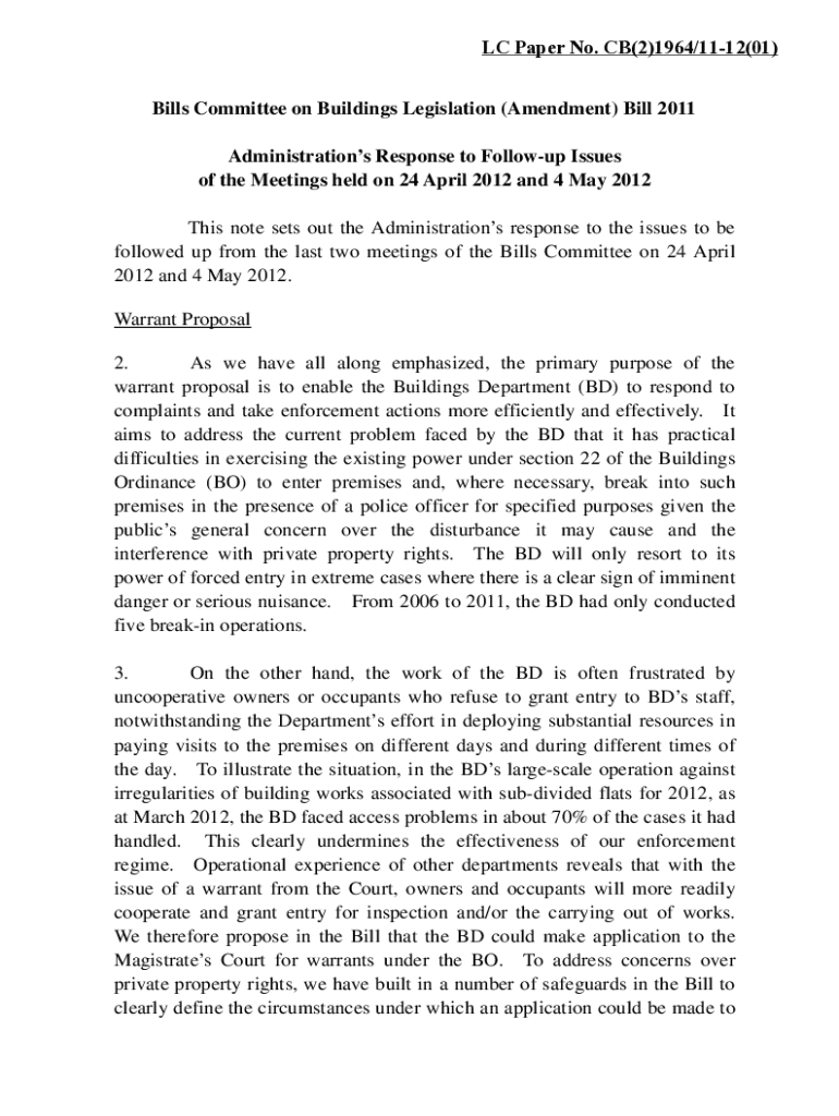 LC Paper No. CB(2)1964/1112(01) Bills Committee on Buildings Legislation (Amendment) Bill 2011 Administrations Response to Followup Issues of the Meetings held on 24 April 2012 and 4 May 2012 This