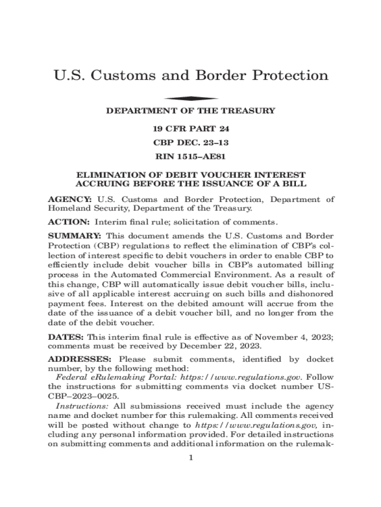 U.S. Customs and Border Protection DEPARTMENT OF THE TREASURY 19 CFR PART 24 CBP DEC. 2313 IN 1515AE81 ELIMINATION OF DEBIT VOUCHER INTEREST ACCRUING BEFORE THE ISSUANCE OF A BILL AGENCY: U.S. Customs