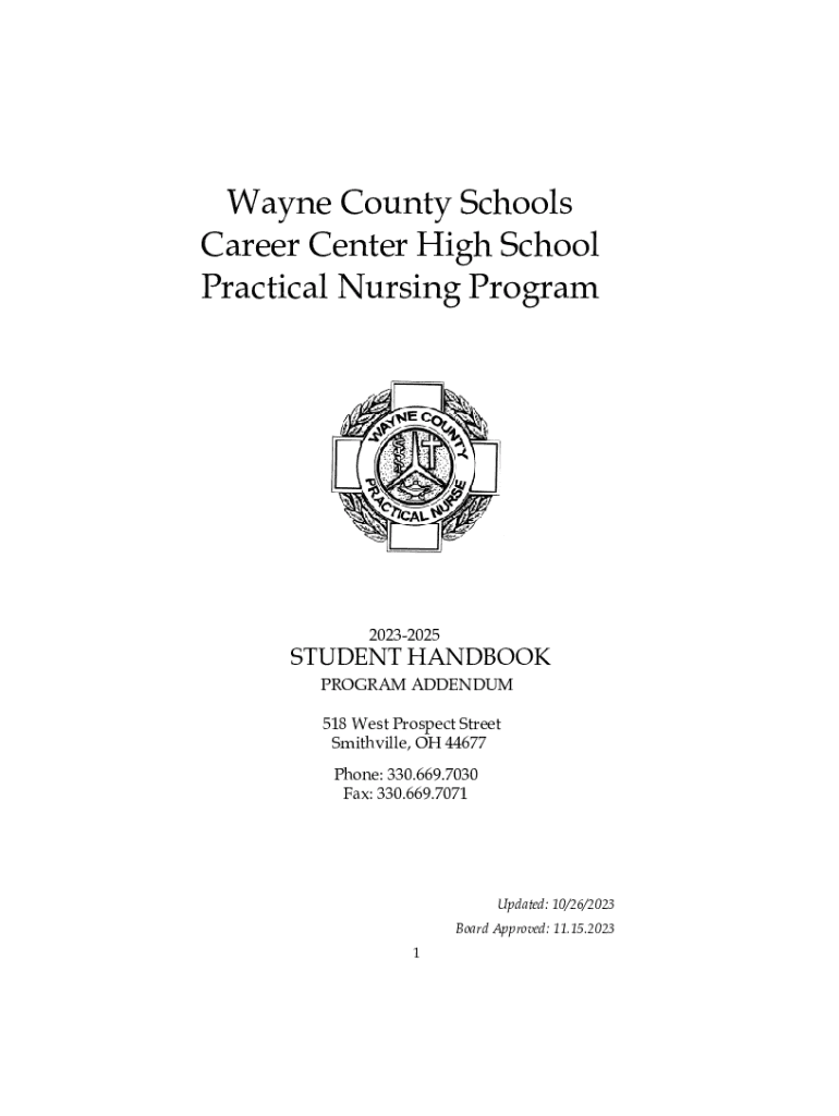 Wayne County Schools Career Center High School Practical Nursing Program20232025STUDENT HANDBOOK PROGRAM ADDENDUM 518 West Prospect Street Smithville, OH 44677 Phone: 330.669.7030 Fax: 330.669.7071Updated: