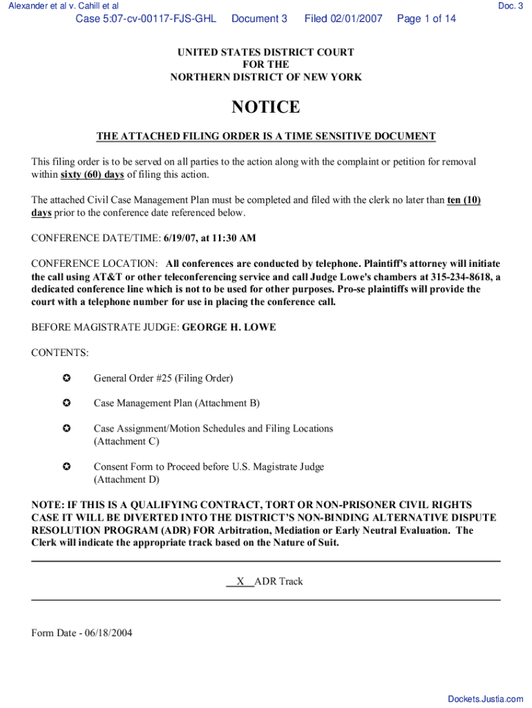 Alexander et al v. Cahill et alDoc. 3Case 5:07cv00117FJSGHLDocument 3Filed 02/01/2007Page 1 of 14UNITED STATES DISTRICT COURT FOR THE NORTHERN DISTRICT OF NEW YORKNOTICE THE ATTACHED FILING ORDER