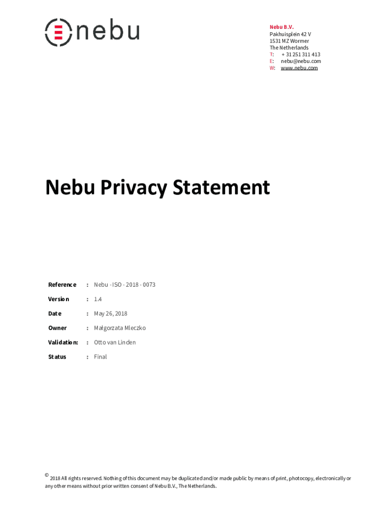 Zebu B.V. Pakhuisplein 42 V 1531 MZ Former The Netherlands T: + 31 251 311 413 E: nebu@nebu.com W: www.nebu.comNebu Privacy Statement Reference: Zebu ISO 2018 0073Version: 1.4Date: May 26, 2018Owner: