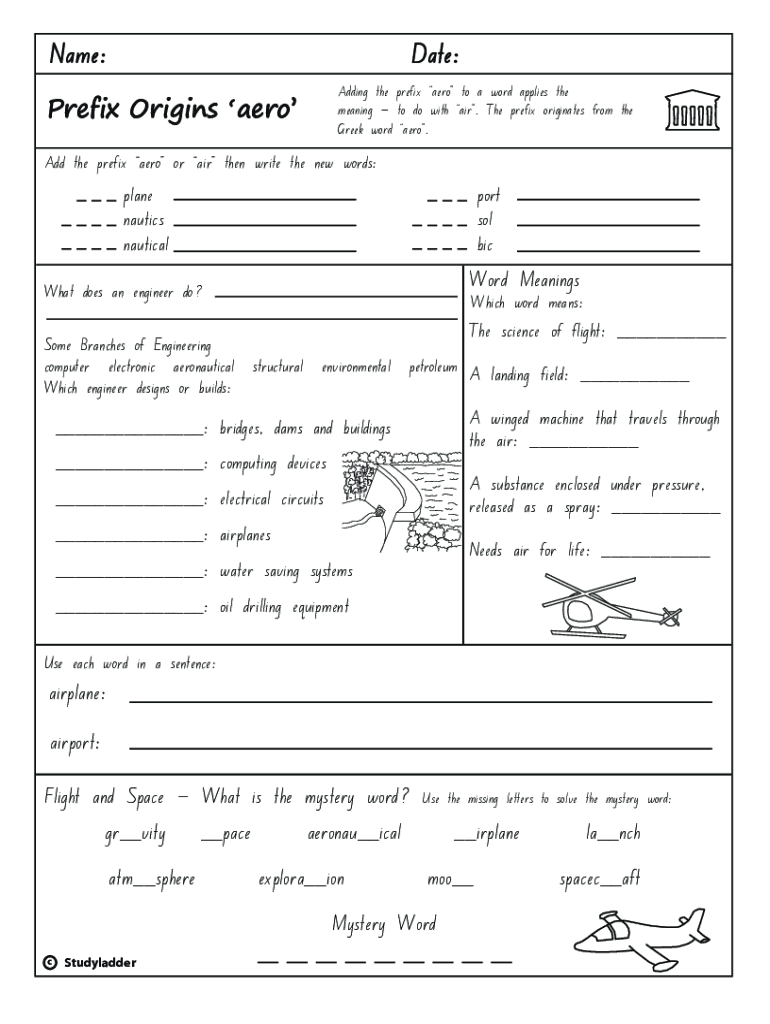 Greek word aero. Add the prefix aero or air then write the new words:plane