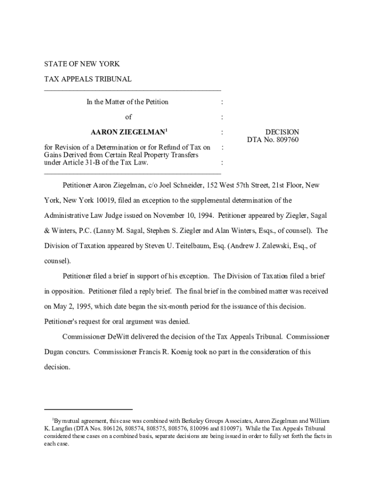 STATE OF NEW YORK TAX APPEALS TRIBUNAL ___ In the Matter of the Petition:of:AARON ZIEGELMAN1:for Revision of a Determination or for Refund of Tax on : Gains Derived from Certain Real Property Transfers
